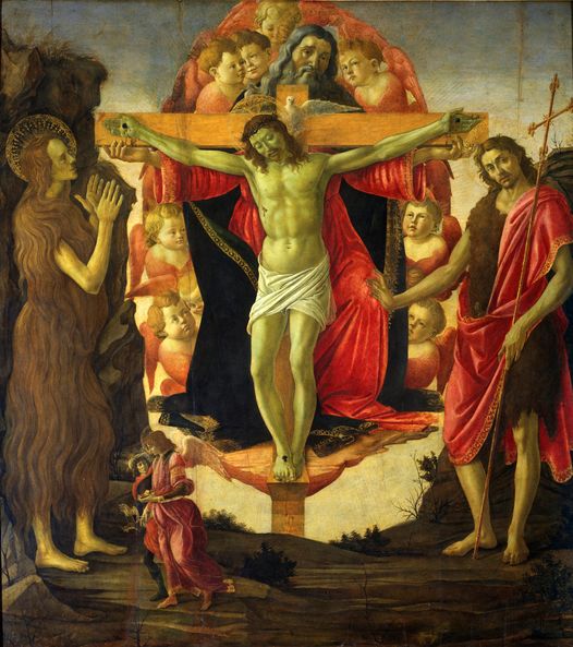 La Sainte Trinité avec sainte Marie-Madeleine et saint Jean-Baptiste, l'archange Raphaël et Tobie. Sandro Botticelli (1445, Florence-1510, Florence) Tempera et huile (?) sur panneau. 233 x 256 cm. The Courtauld Institute of Art, Londres. 1491-1494. Une vision de la...